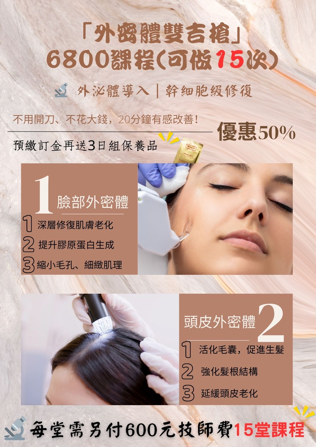 3 萬 3 做 20 次外泌體課程,再送 8 件保養品+2 瓶五行香水,課程+產品一次到位!